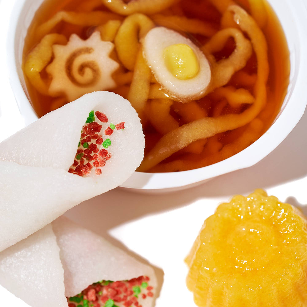 Get ready to get cookin’...some ramen! You’ll use the included mold, tools, and powders to make a full DIY gummy meal. Add water to the powder in one of the mold compartments, it will start to gel up and you can begin building. Make a bowl of ramen, mango pudding, spring rolls, and gyoza, all of which have funky flavors like cola, ramune, strawberry, and mango.