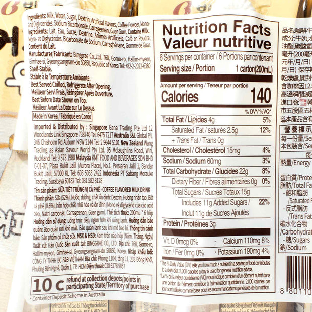 Here's a way you can get your coffee fix in without increasing your caffeine intake! Binggrae coffee milk offers a delicious, sweet coffee-flavored drink that satisfies any latte cravings. Since this drink contains no caffeine, you can pack it in your kid's lunches. Try blending this flavored milk with ice cream for a yummy coffee milkshake.