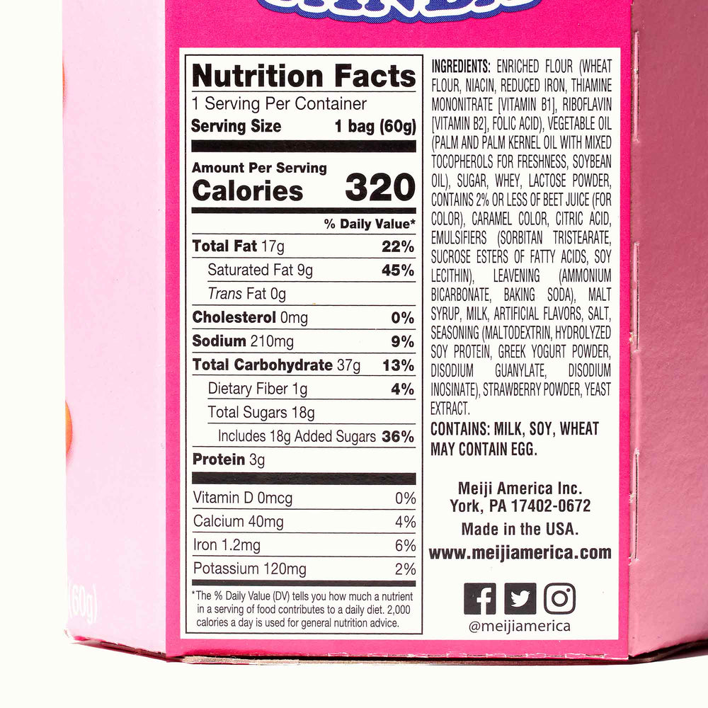 The back of a pink box with a Meiji Hello Panda: Strawberry label on it.