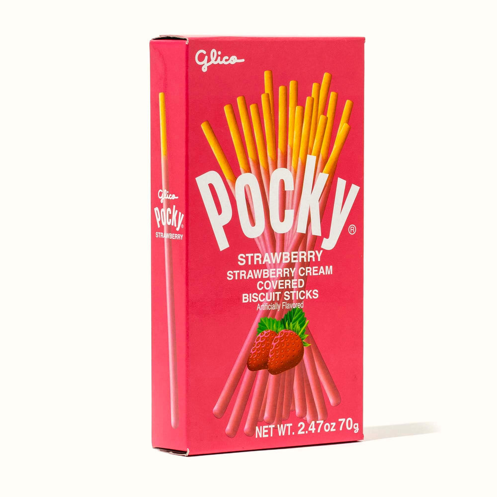A box of Glico Pocky: Strawberry sticks on a white background.