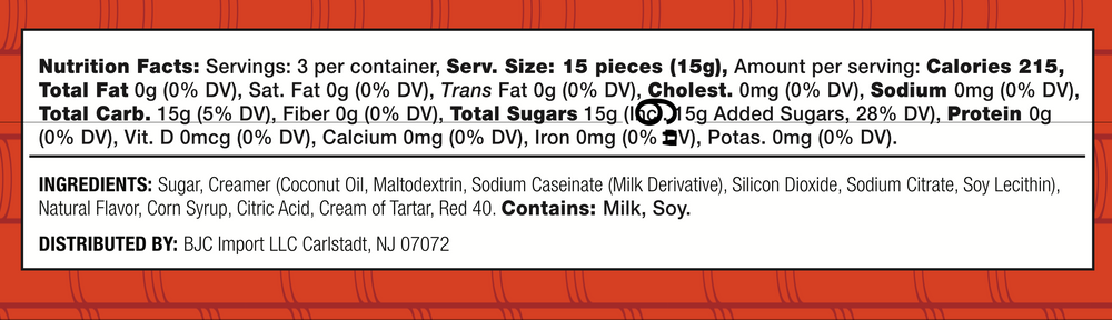 Nutrition label for Japanese Candy Bites Duo: White Strawberry & Sour Yuzu—serving size 15 pieces, 215 calories, 0g fat, 15g sugars, 0g protein; contains milk and soy. Flavors: Sour Yuzu and White Strawberry.