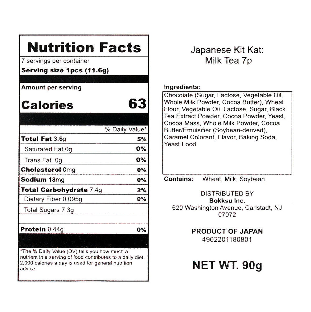 Image of a nutritional facts label and an ingredients list for a Nestle Japan Milk Tea Kit Kat product, presented in a clear, black and white format.